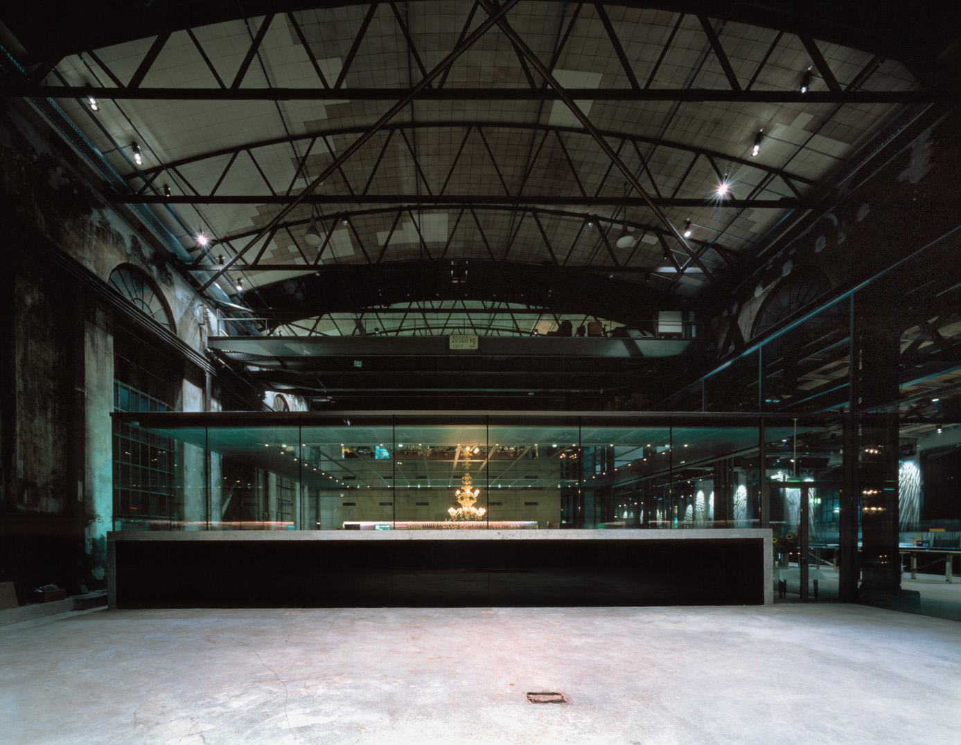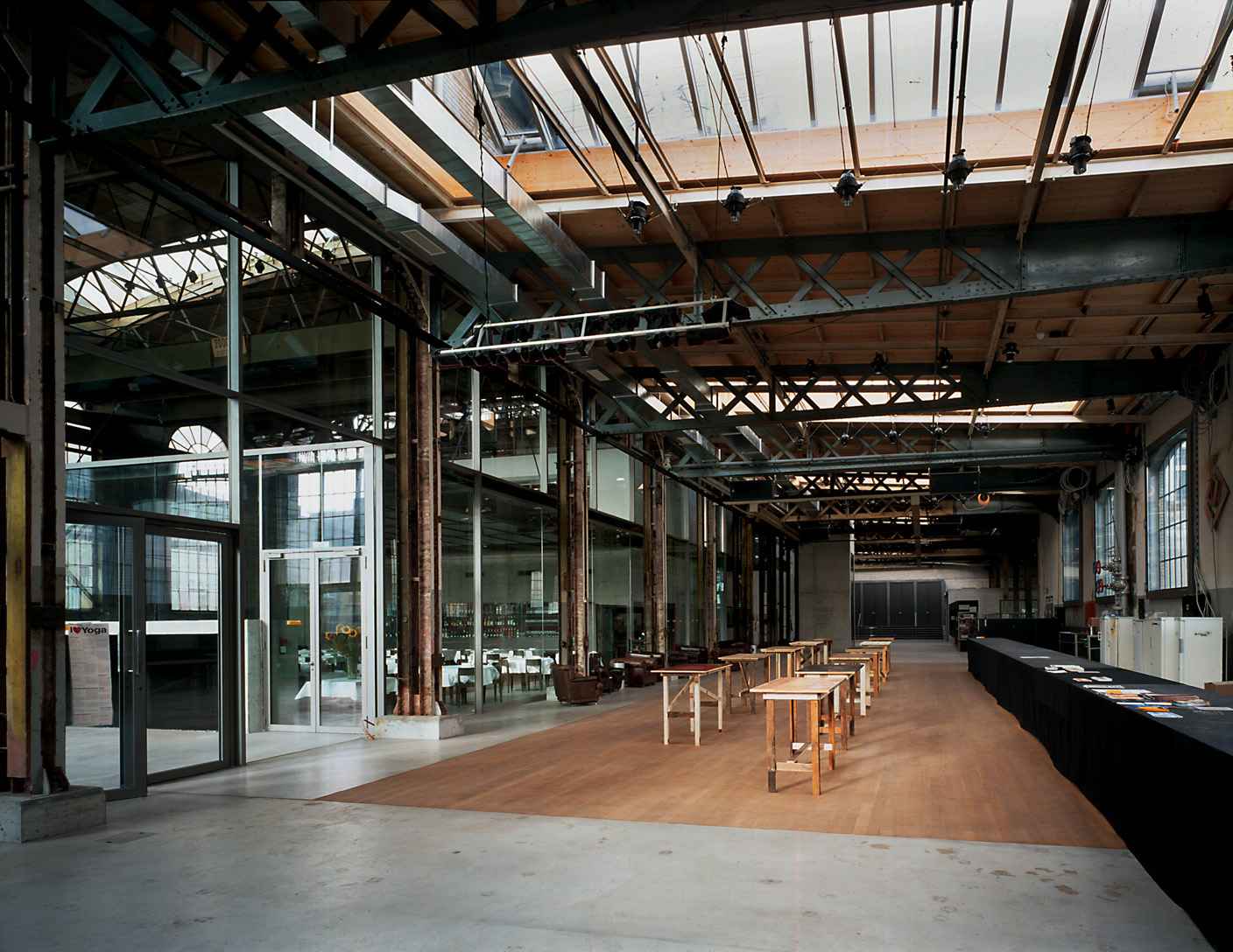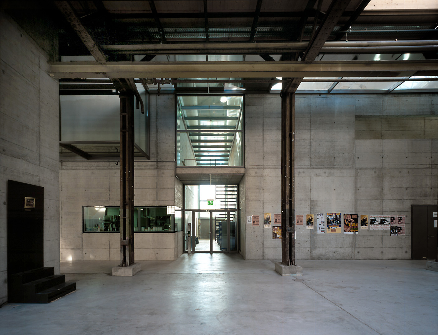 Auf dem abgewirtschafteten Industrieareal neben einer aufgeständerten Stadtautobahn blieb die 120 m lange, denkmalgeschützte Schiffbau-Halle nahezu unangetastet und somit ihr ältlich-schäbiger Charme erhalten. Mit einer Wandstärke von etwa 25 cm und flächigen, einfach verglasten Fenstern als Innenraum kaum brauchbar, bildet sie als Foyer und Verteiler nur die Hülle für architektonisch simple Einbauten: einen Restaurant-Kubus, einen Jazz-Club, das „Hallentheater“ und das Studiotheater in der „Box“.