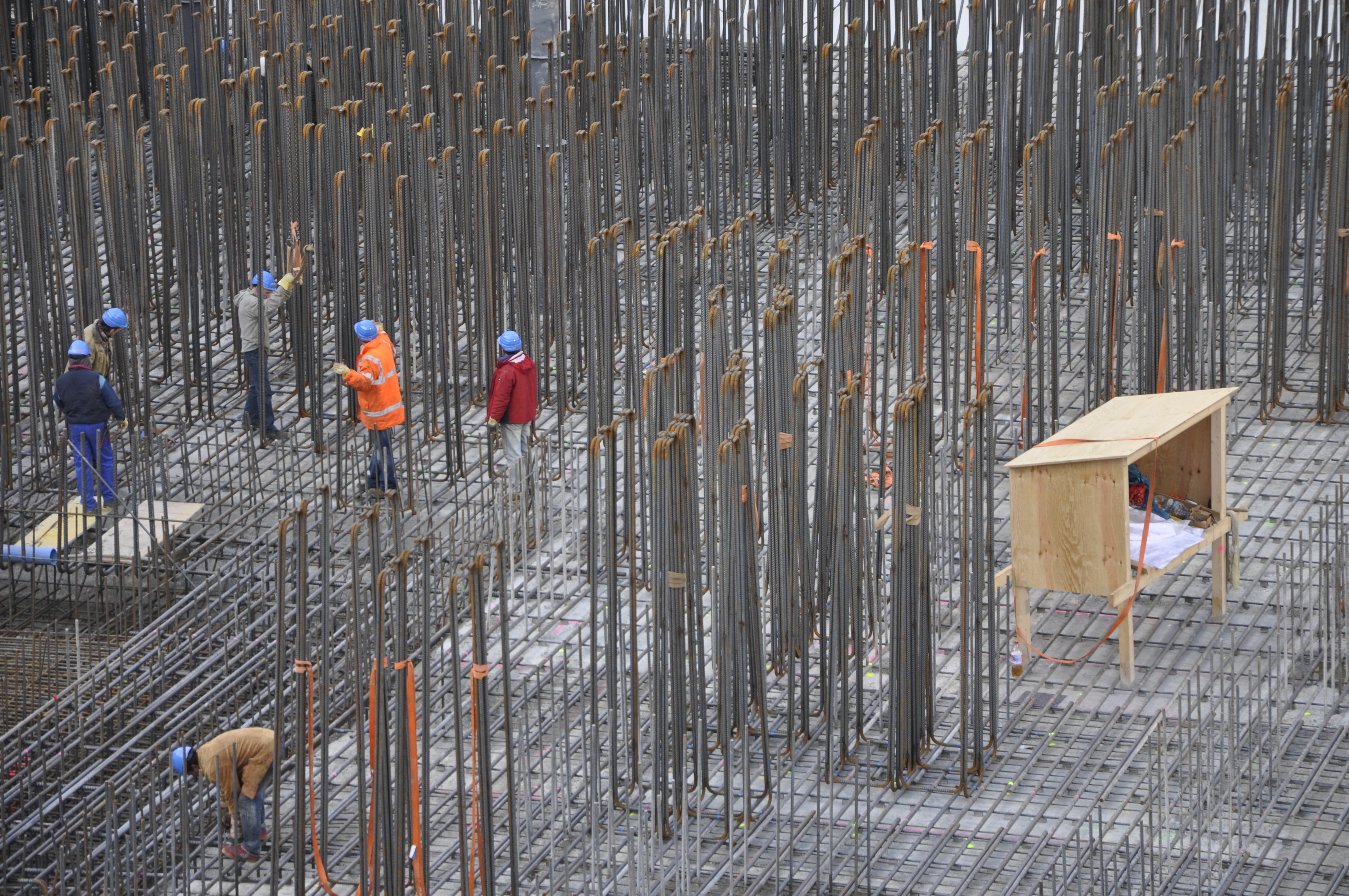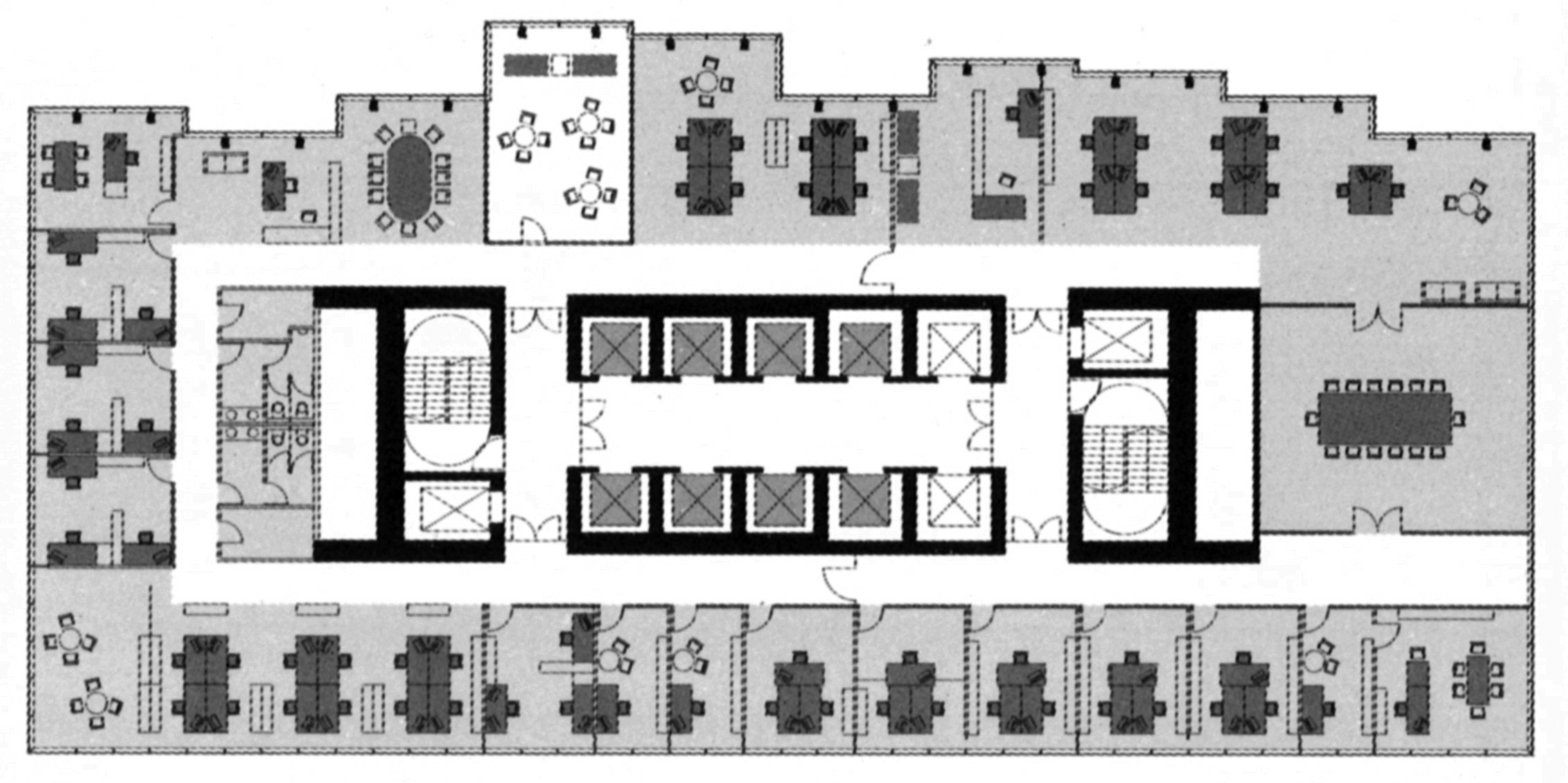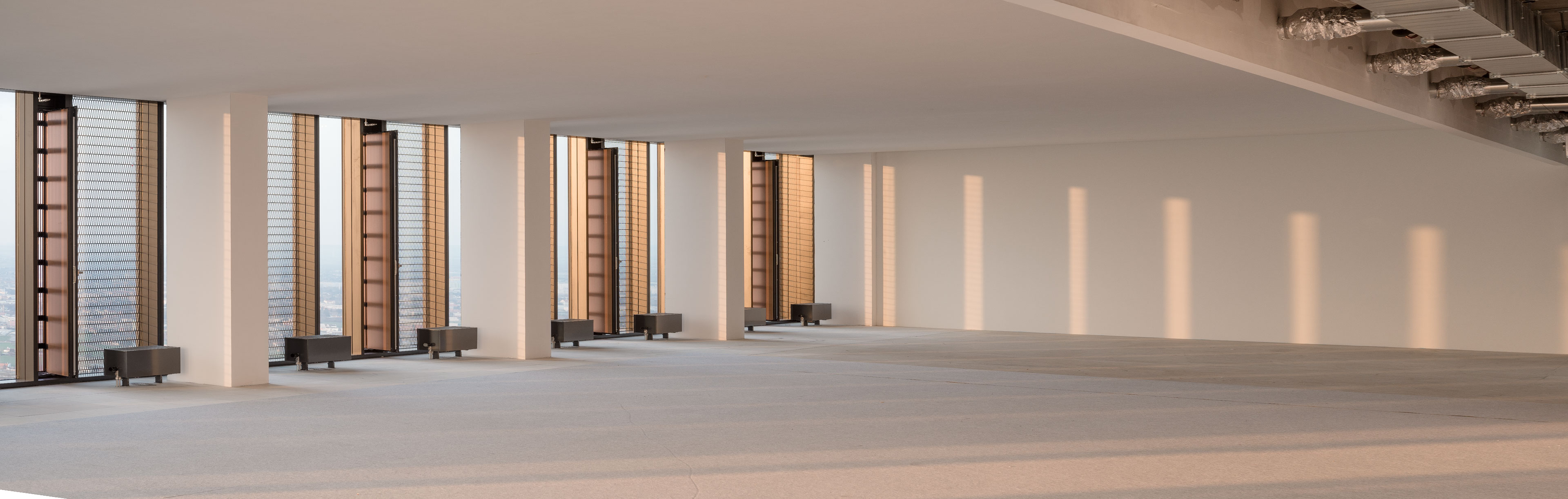Der auf beste Tragwirkung bei geringstem Flächenverbrauch hin optimierte Kern ist mit einem Verhältnis Kernbreite zu Gebäudehöhe von 21,5 verhältnismäßig schmal und reicht zur Aussteifung nicht aus. Deshalb wurde erstmals im Hochhausbau eine Konstruktion angewandt, die zunächst einfach erscheint, aber doch Neuland bedeutete: In den Haustechnikgeschossen auf den Ebenen 16/17 und 43/44 sind 200 cm dicke Stahlbetonflachdecken als sogenannte Outrigger eingebaut. Zusammen mit tragenden Außenstützen gewährleisten sie die Stabilität.