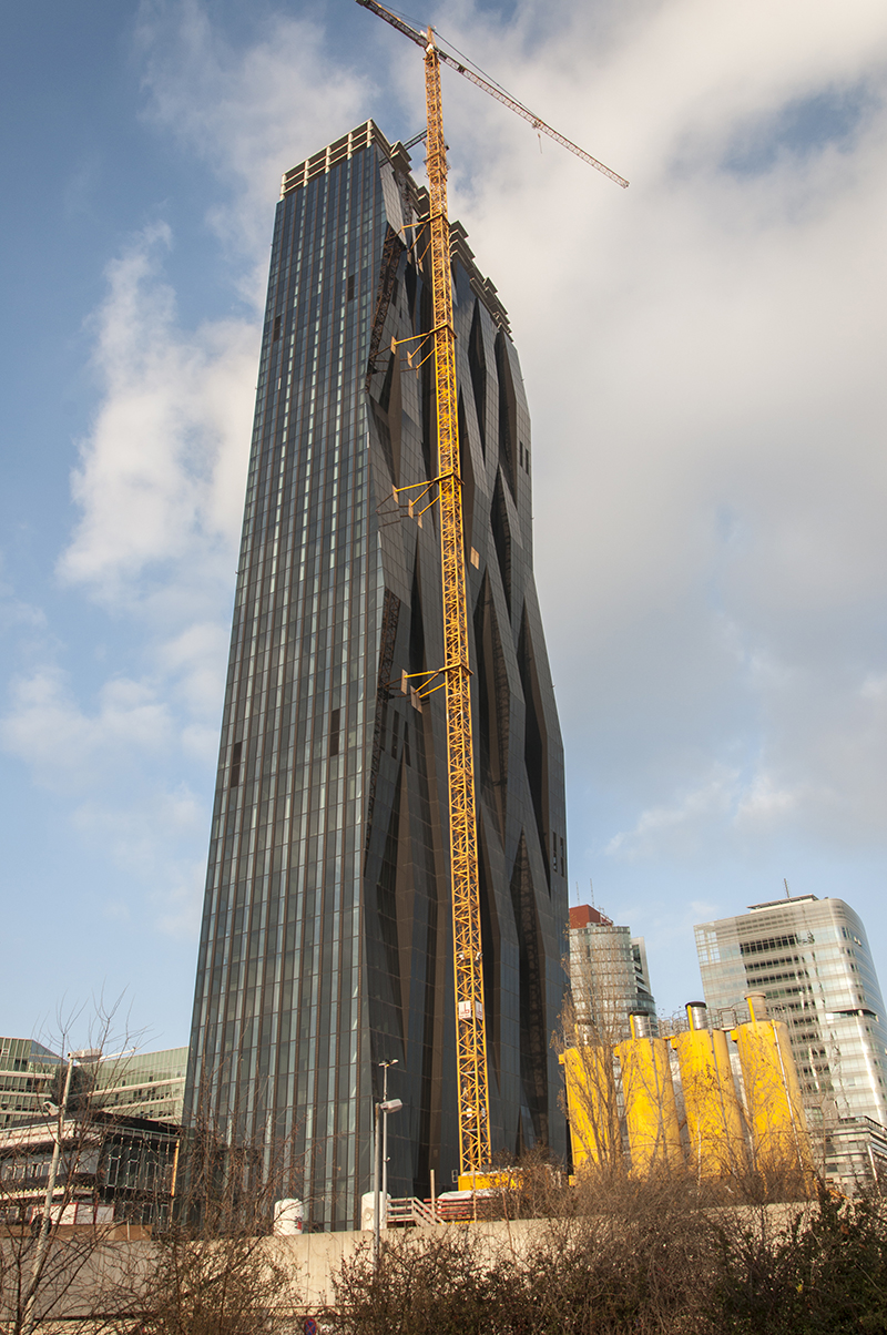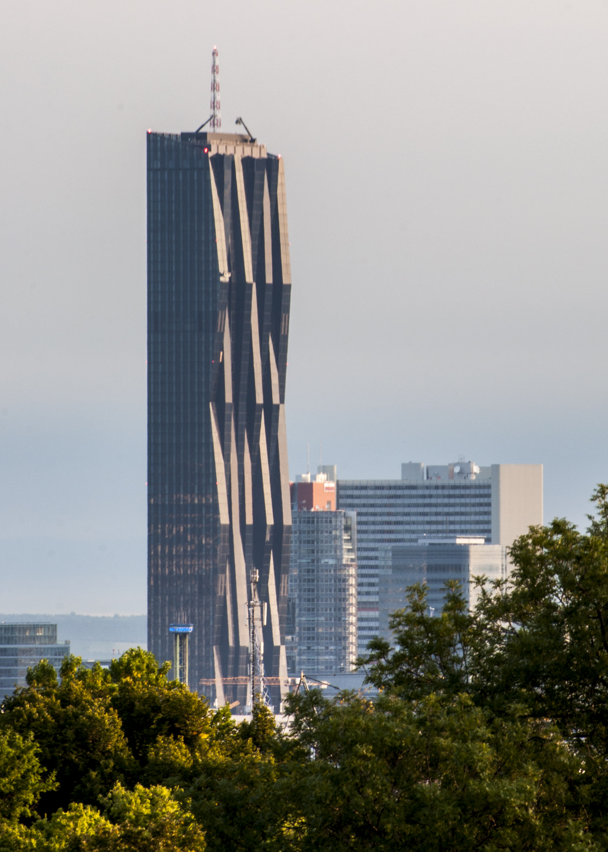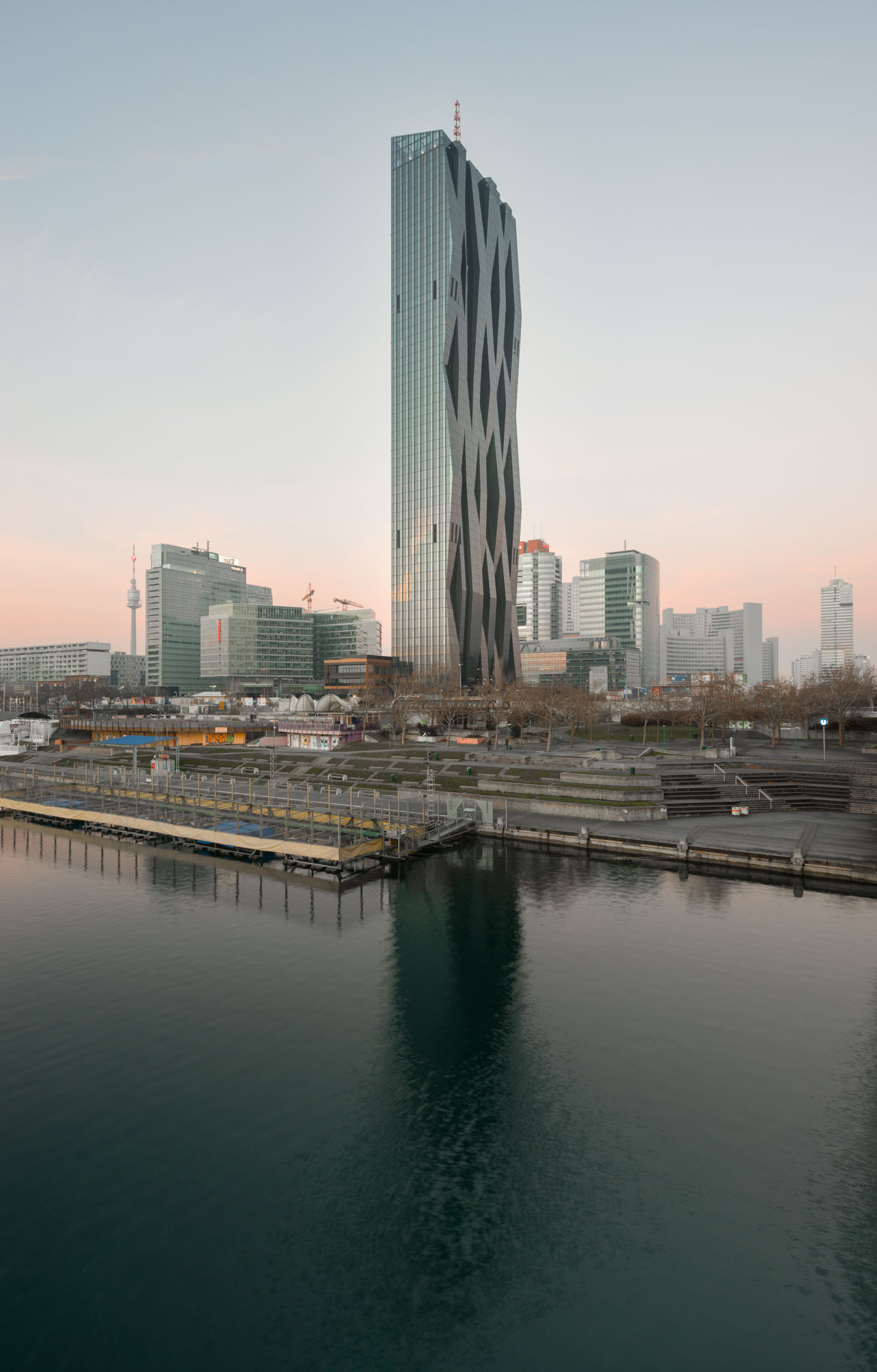 Der Gebäudeform liegt der Gedanke eines auseinandergebrochenen Monolithen zugrunde, dessen zerklüftete Südöstseite mit Turm 2 seine Negativform erhalten hätte sollen. Vertikal in einzelne, mehrfach geknickte Bahnen aufgeteilt, evoziert diese Ansicht auch das Bild von Wellen auf der Donau. Auf den 60 Etagen sind Büro- und Hotelräume untergebracht, dazu Gastronomie und Fitnessangebote.