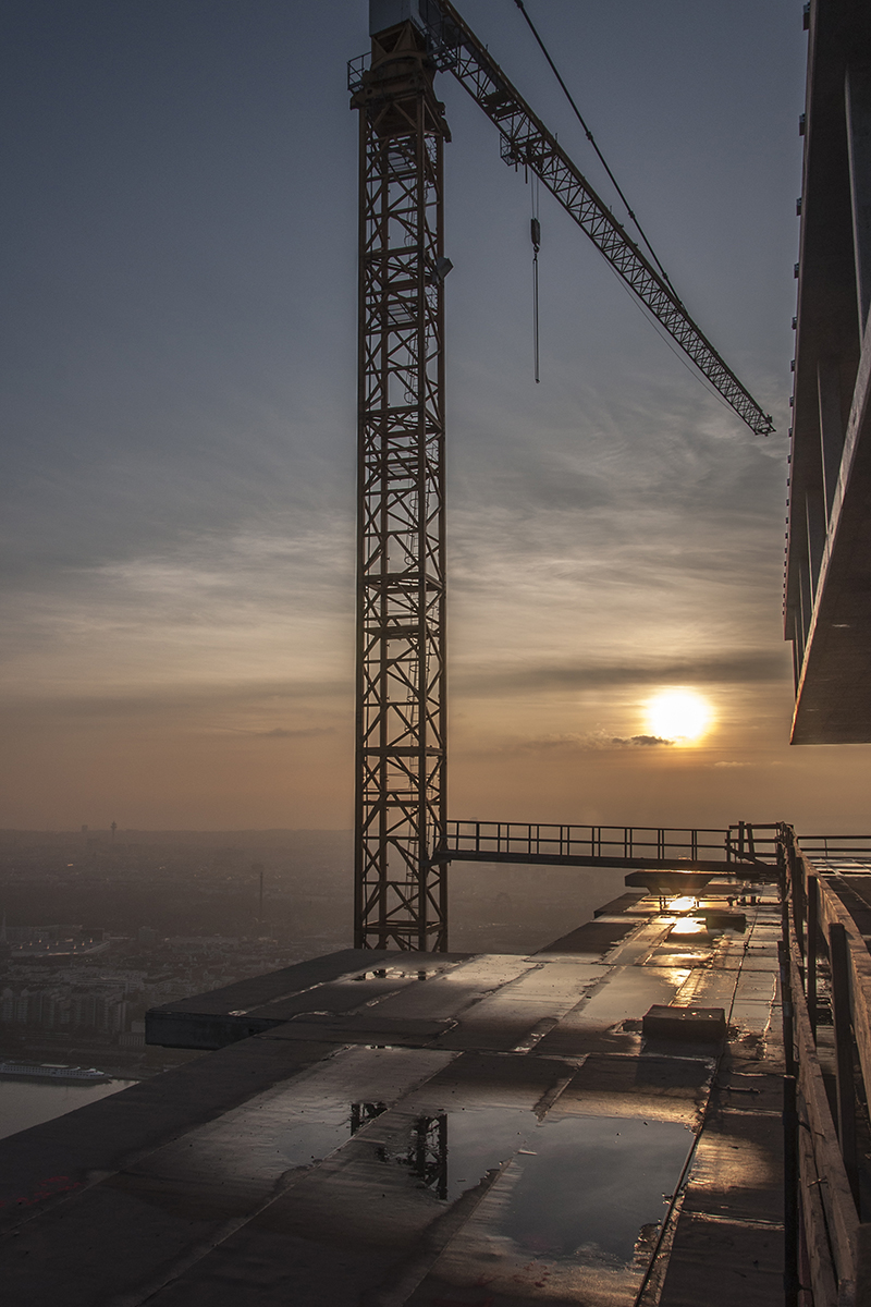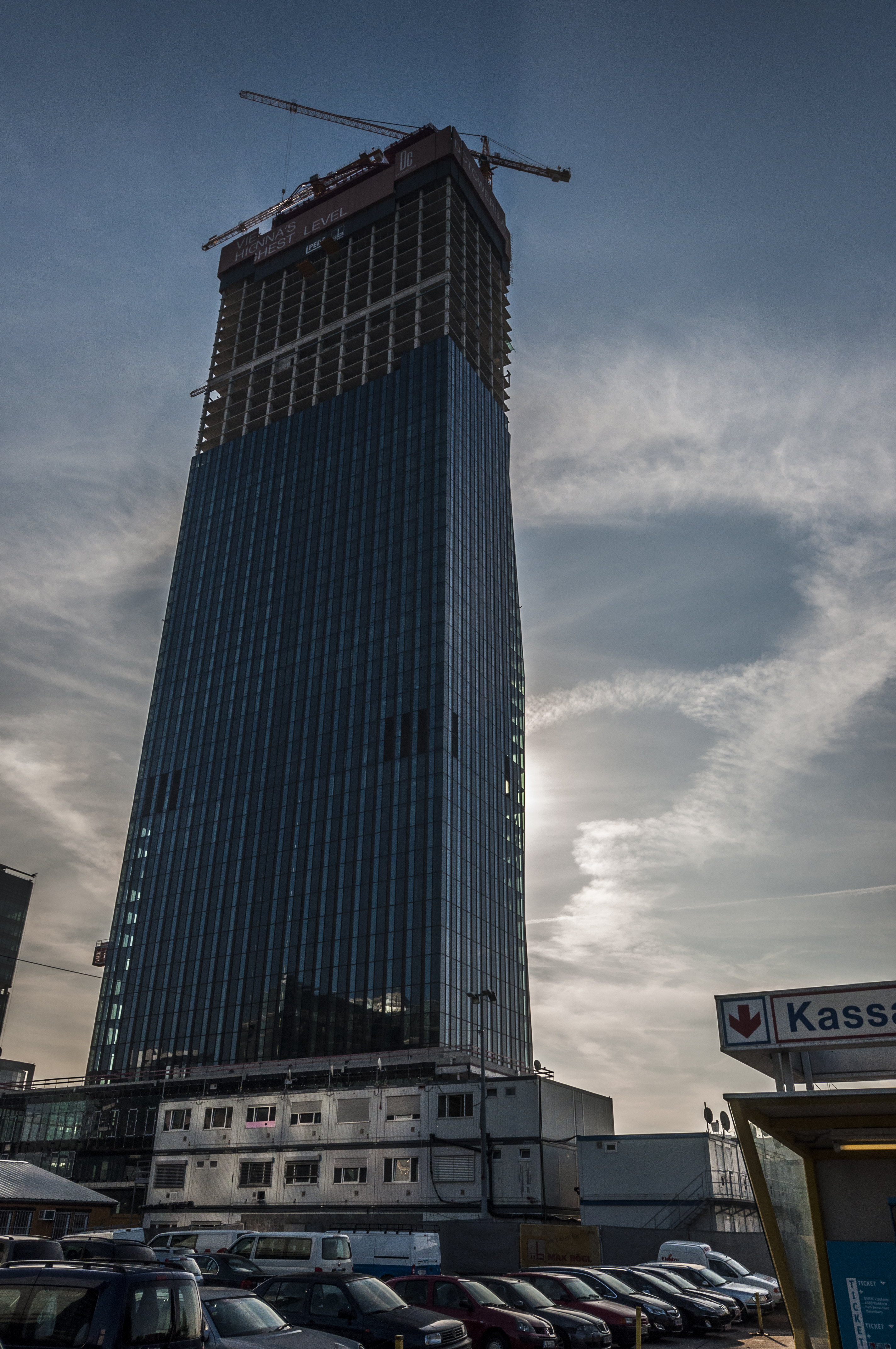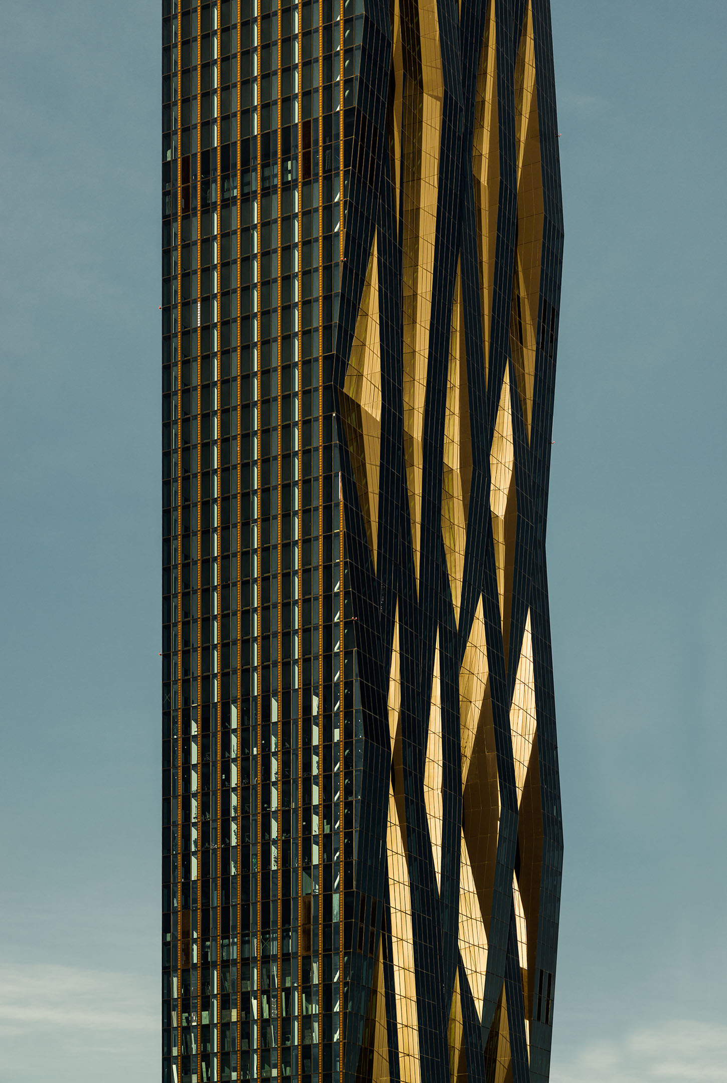 Der Gebäudeform liegt der Gedanke eines auseinandergebrochenen Monolithen zugrunde, dessen zerklüftete Südöstseite mit Turm 2 seine Negativform erhalten hätte sollen. Vertikal in einzelne, mehrfach geknickte Bahnen aufgeteilt, evoziert diese Ansicht auch das Bild von Wellen auf der Donau. Auf den 60 Etagen sind Büro- und Hotelräume untergebracht, dazu Gastronomie und Fitnessangebote.